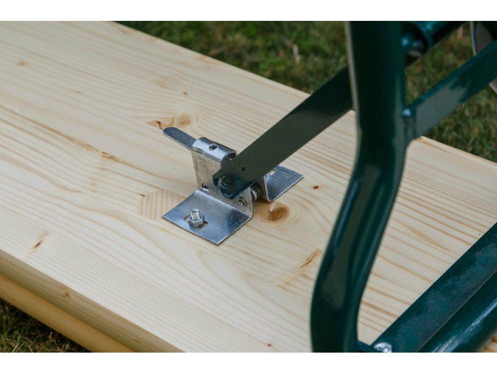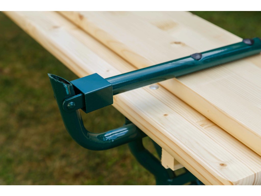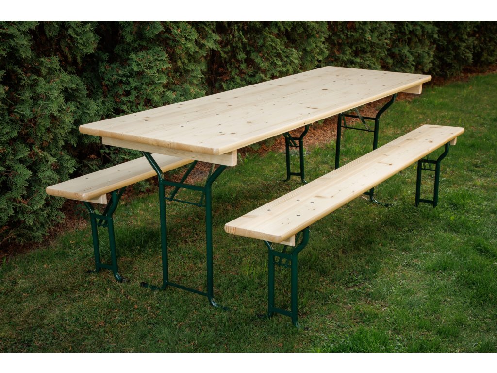 A pad méretei: hossza 220 cm, szélessége 25 cm, magasság 48 cm, fa vastagsága 3 cm. A vaskeret és a lábak átmérője 3 cm. A megadott méretek tájékoztató jellegűek és +/-3% eltéréssel változhatnak. A keret porfestett, színe zöld. A bútorok tömör fenyőfából készültek. A faanyagot három rétegben átlátszó, kétkomponensű poliuretán lakk és keményítővel lakkozták Gyors, egyszerű összeállítás és szétszerelés – könnyen tárolható Egy sörkészlet 8-10 fő befogadására alkalmas.