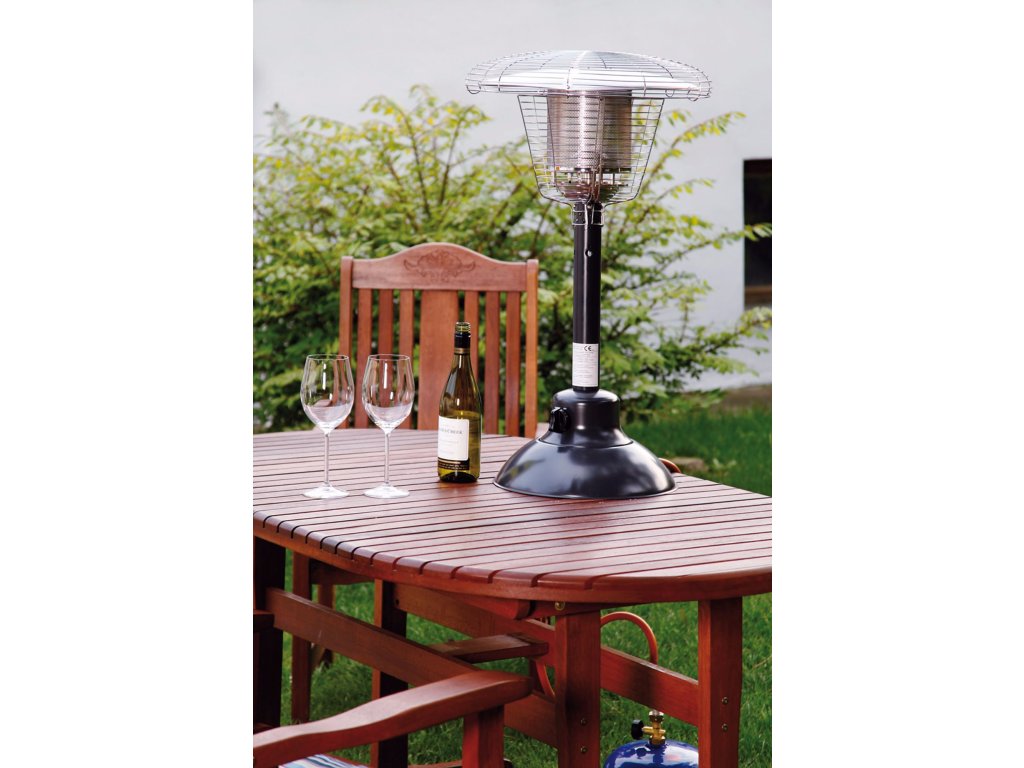 Teljes műszaki leírás Lakkozott kivitelű Erőteljes asztali kerti fűtőberendezés, ideális nem csak a nyári estékhez Akár 3 méter átmérőjű hőt ad le A 10 kg-os palack használatára tervezett nyomásszabályozóval és tömlővel szállítva Vigyázat! A 2 kg-os palack használatához a "2156UV egyutas szelep" terméket kell megvásárolnia webáruházunkból A fűtőtest biztonsági szeleppel van ellátva, amely leejtés esetén elzárja a gázellátást! Teljesítmény (kW) - 4 Tömeg (kg) - 6,8kg Fogyasztás (g/óra) - 180-250 Méretek (h) - 800mm