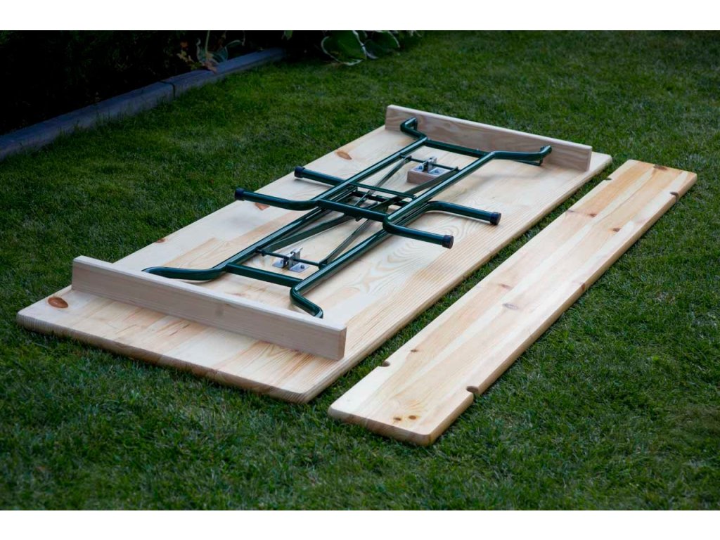 - Tömör fenyőből készült fa bútor, fém összecsukható csővázon